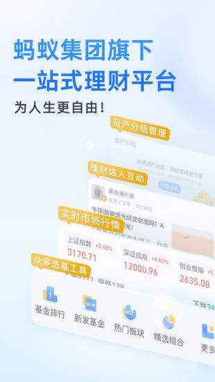 蚂蚁财富APP是蚂蚁集团旗下一站式理财平台。包含各类理财产品、理财服务、社区互动等特色功能,平台覆盖超9300支基金,申购费用1折起,致力为投资者提供更安全更全面的一站式理财平台。余额宝、基金、黄金、定期等理财品类齐全,全面覆盖实时财经资讯、行情信息、市场解读。呈现自选股票&基金实时信息,提供全面及时的自选资讯、大事件、异动提醒等服务。